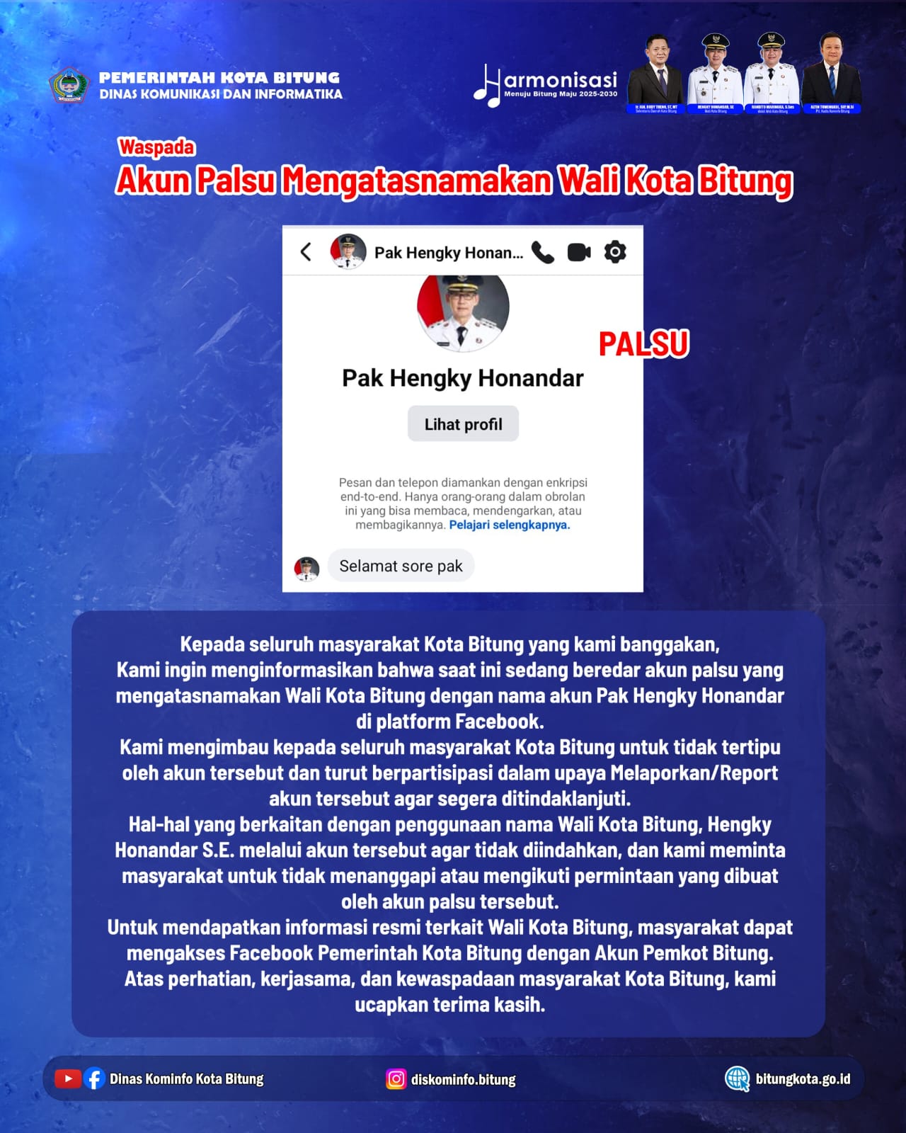 ESN, Bitung – Dinas Komunikasi dan Informatika (Kominfo) Kota Bitung mengeluarkan imbauan resmi kepada masyarakat agar waspada terhadap beredarnya akun palsu di media sosial Facebook yang mengatasnamakan Wali Kota Bitung, Hengky Honandar.