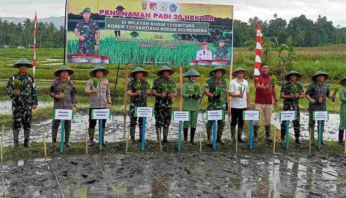 ESN, Bitung — Dalam rangka mendukung program ketahanan pangan nasional, Komandan Korem 131/Santiago Brigjen TNI Martin Susilo Martopo Turnip, SH., MH, turun langsung ke sawah melakukan penanaman padi di Kelurahan Tanjung Merah, Kecamatan Matuari, Kamis (21/8/2025).