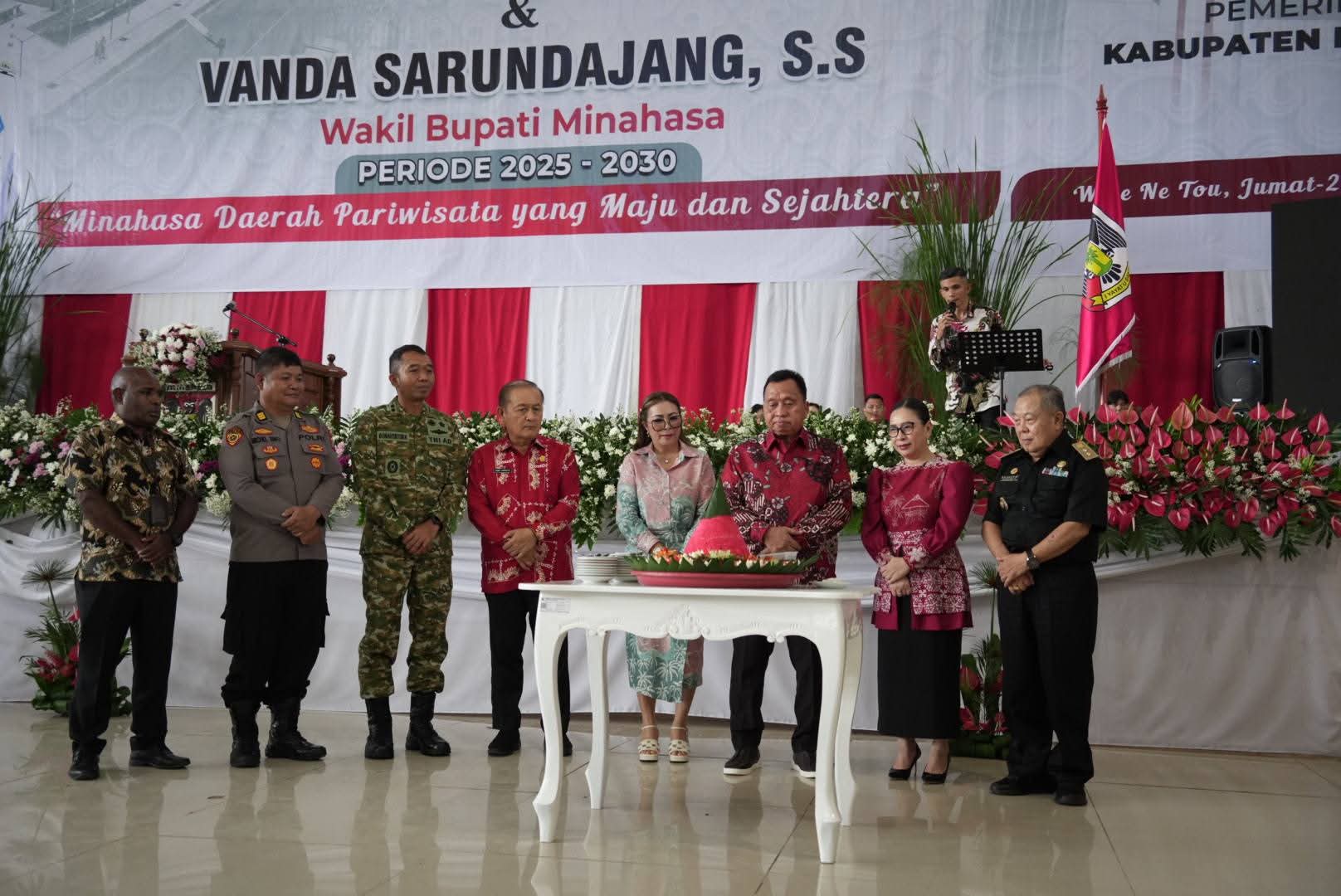 Suasana penuh sukacita dan optimisme terlihat saat kedua pemimpin Minahasa itu melakukan prosesi pemotongan tumpeng sebagai simbol rasa syukur atas perjalanan pemerintahan sejak dilantik Presiden Prabowo Subianto pada 20 Februari 2025.