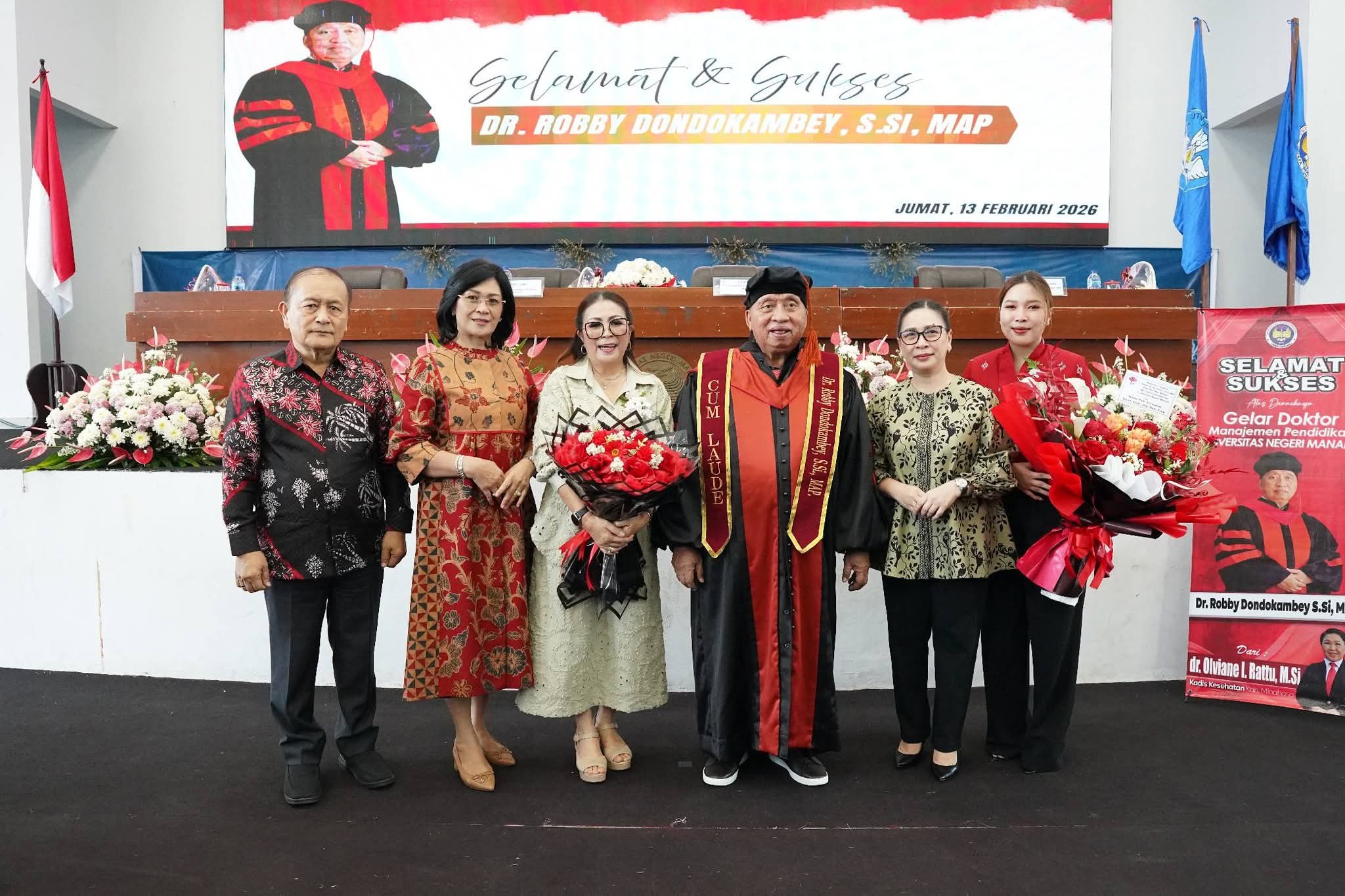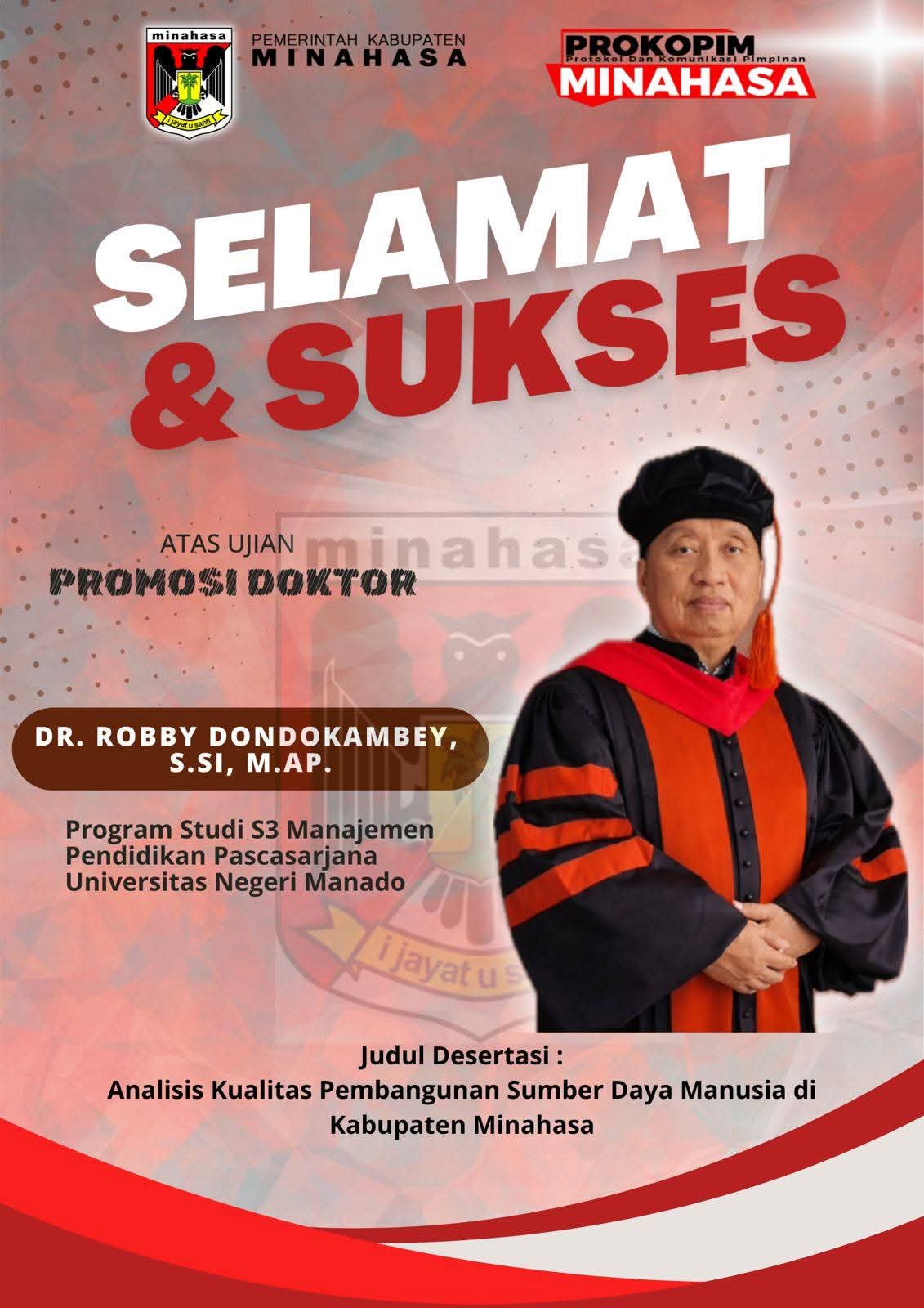 ESN, Tondano – Bupati Minahasa Robby Dondokambey berhasil menyandang gelar Doktor dalam bidang Manajemen Pendidikan dari Universitas Negeri Manado (Unima).