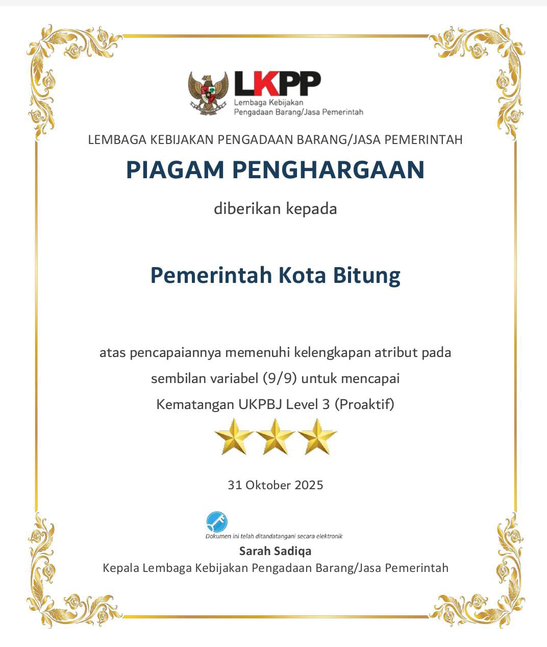 Dalam surat tersebut, LKPP menyampaikan apresiasi atas capaian UKPBJ Kota Bitung yang telah memenuhi seluruh sembilan variabel penilaian (9/9) dalam Sistem Informasi Model Kematangan UKPBJ (SIMKU), sehingga ditetapkan berada pada level proaktif.