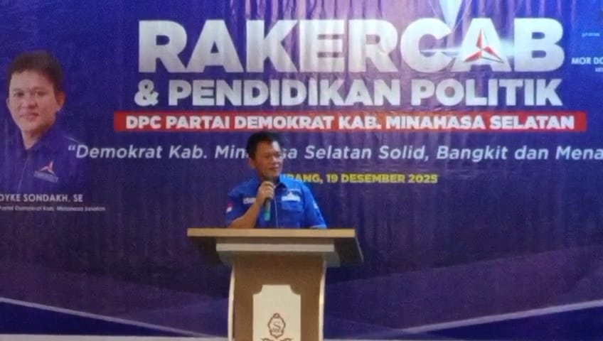 ESN, Minsel — Ketua DPC Partai Demokrat Kabupaten Minahasa Selatan, Royke Sondakh, SH, secara resmi membuka Rapat Kerja Cabang (Rakercab) yang dirangkaikan dengan Pendidikan Politik DPC Partai Demokrat Minahasa Selatan. Kegiatan ini digelar di Hotel Sutan Raja, Kecamatan Amurang Timur, Jumat (19/12/2025).