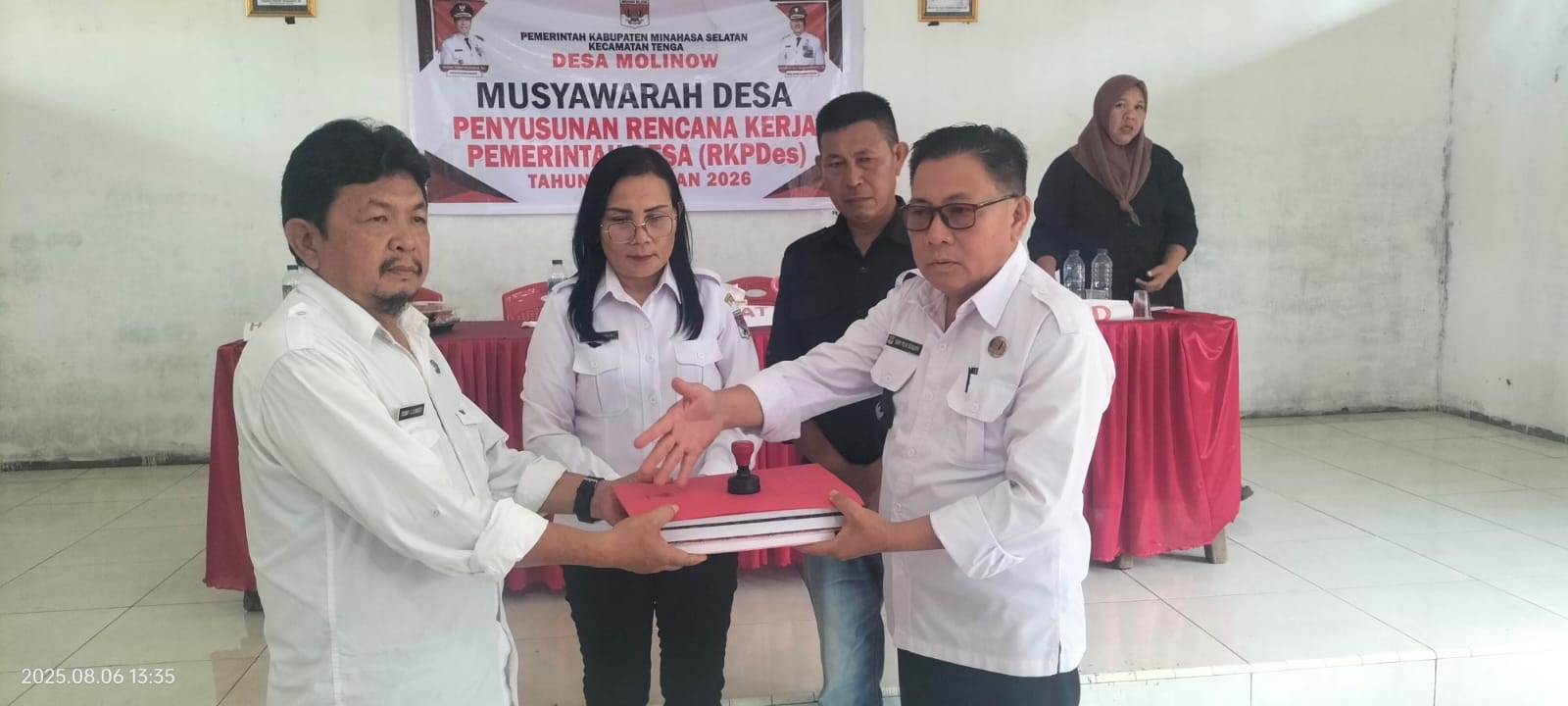ESN, Minahasa Selatan — Pemerintah Desa Molinow, Kecamatan Tenga, Kabupaten Minahasa Selatan (Minsel), melaksanakan serah terima jabatan (sertijab) administrasi dan aset desa, Rabu (6/8/2025).