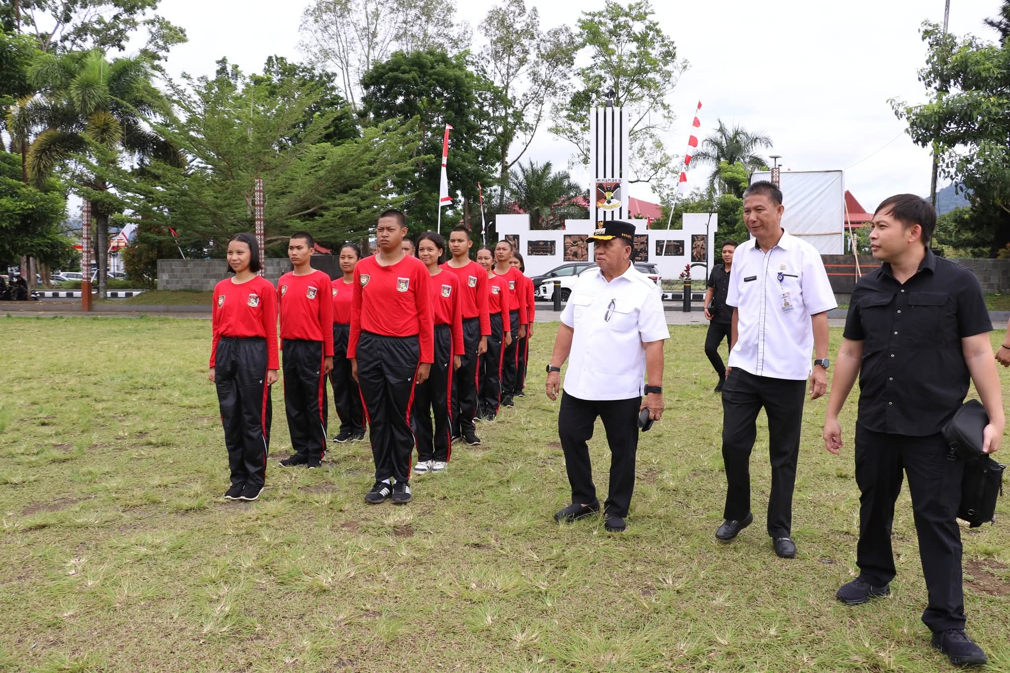 ESN, Tondano – Bupati Minahasa Robby Dondokambey (RD) meninjau latihan yang dilakukan oleh Pasukan Pengibar Bendera Pusaka (Paskibraka) di Lapangan Sam Ratulangi Tondano, Rabu (6/8/2025).